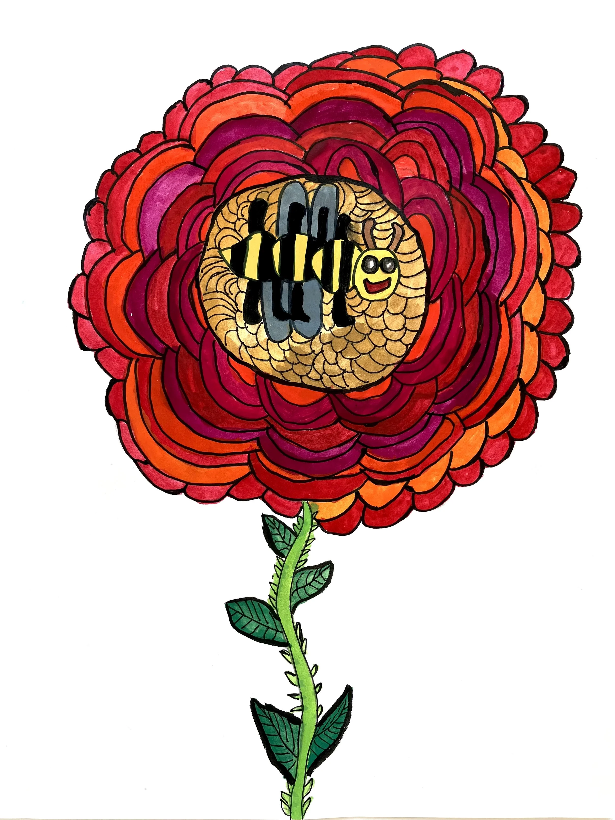 Below are two artworks that Philomena chose from Michael’s collection, alongside the accompanying poems that she wrote to go with them. There are also three artworks that Philomena created inspired from her conversations with Michael about his collection. Left to right they are: A Lamp that is alive (2023), The dog (2024), A bee on a rose (2023).